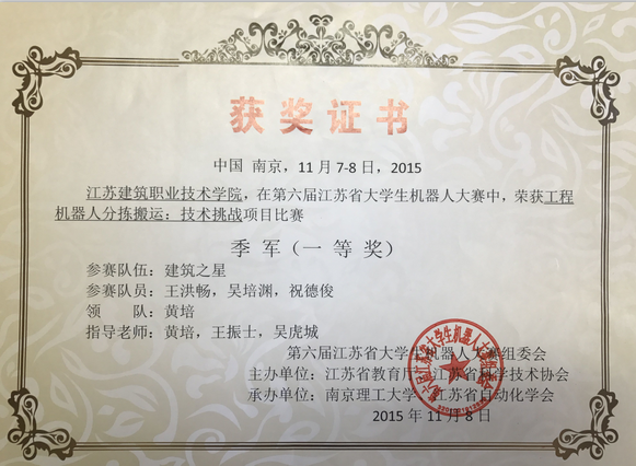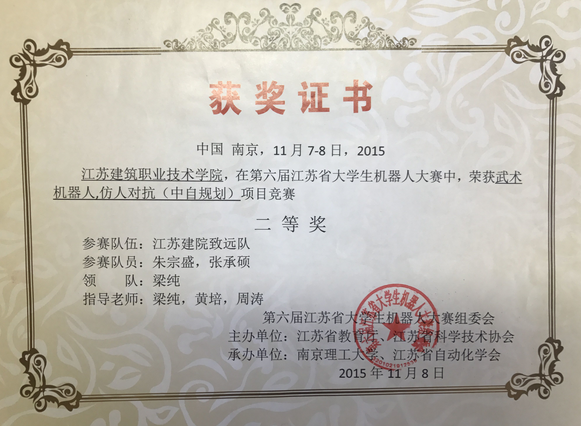 2015年11月第六届江苏省老员工机器人大赛一等奖,二等奖,三等奖