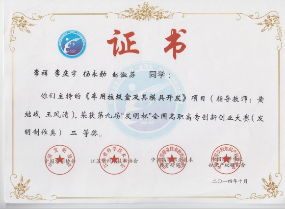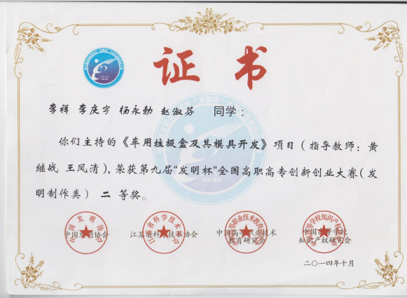 2015年10月第九届“发明杯”全国高职高专创新创业大赛二等奖