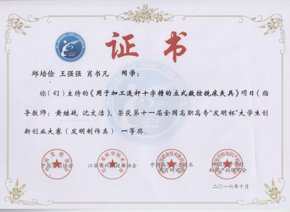 2016年10月第十一届全国高职高专“发明杯”老员工创新创业大赛一等奖