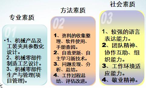 培养目标】本专业主要为机械制造技术应用领域的设计、制造、管理、服务等一线岗位,培养能力强、素质高、懂技术、会管理的高技能应用型专门人才。