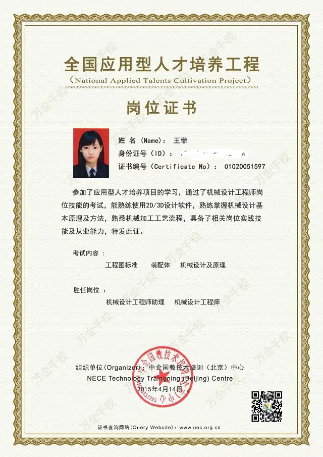 【专业资格证书】(1)钳工职业资格证书(中、高级);(2)车工职业资格证书(中、高级);(3)AutoCAD资格证书;(4)三维CAD资格证书;(5)数控车、铣、加工中心操作职业资格证书(中级、高级);(6)英语、计算机应用能力等级证书。