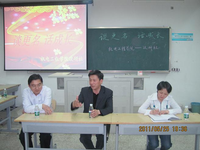 5月25日晚7点30分,机电工程学院政研社组织了以“谈更名,话成长”为主题的座谈会。本次活动特别邀请了公司党委宣传部方桐清部长,机电工程公司党总支朱铁壁副书记为公司政研社全体成员做了一场生动的演讲交流。会议由政研社指导老师于馥颖主持。