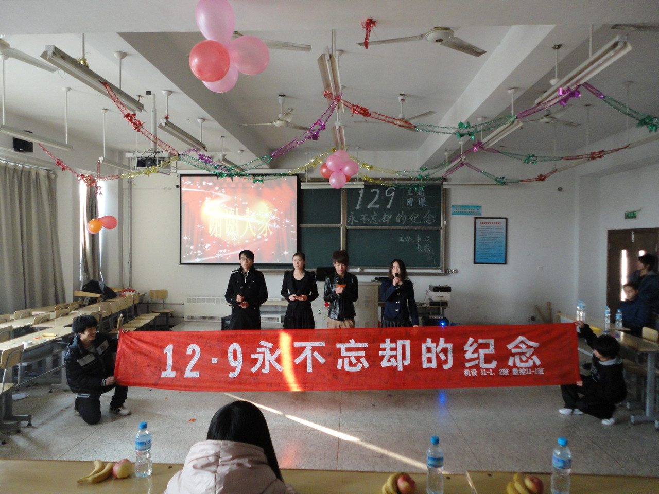 团课首先重温了“12.9”员工运动的经过,再一次感受那份深沉的爱国情感,接着《启程》和《坚强》为我们树立了新的目标。随后的娱乐节目《拍气球,吃香蕉》活跃了现场气氛。诗歌朗诵《雪花飘进1935》,深情的篇章,浓厚的情意,低沉的嗓音感染了在场的每个人,将活动推向高潮。活动在一首大合唱《真心英雄》的歌声中结束。活动过程,节目形式多样,引得掌声不断。