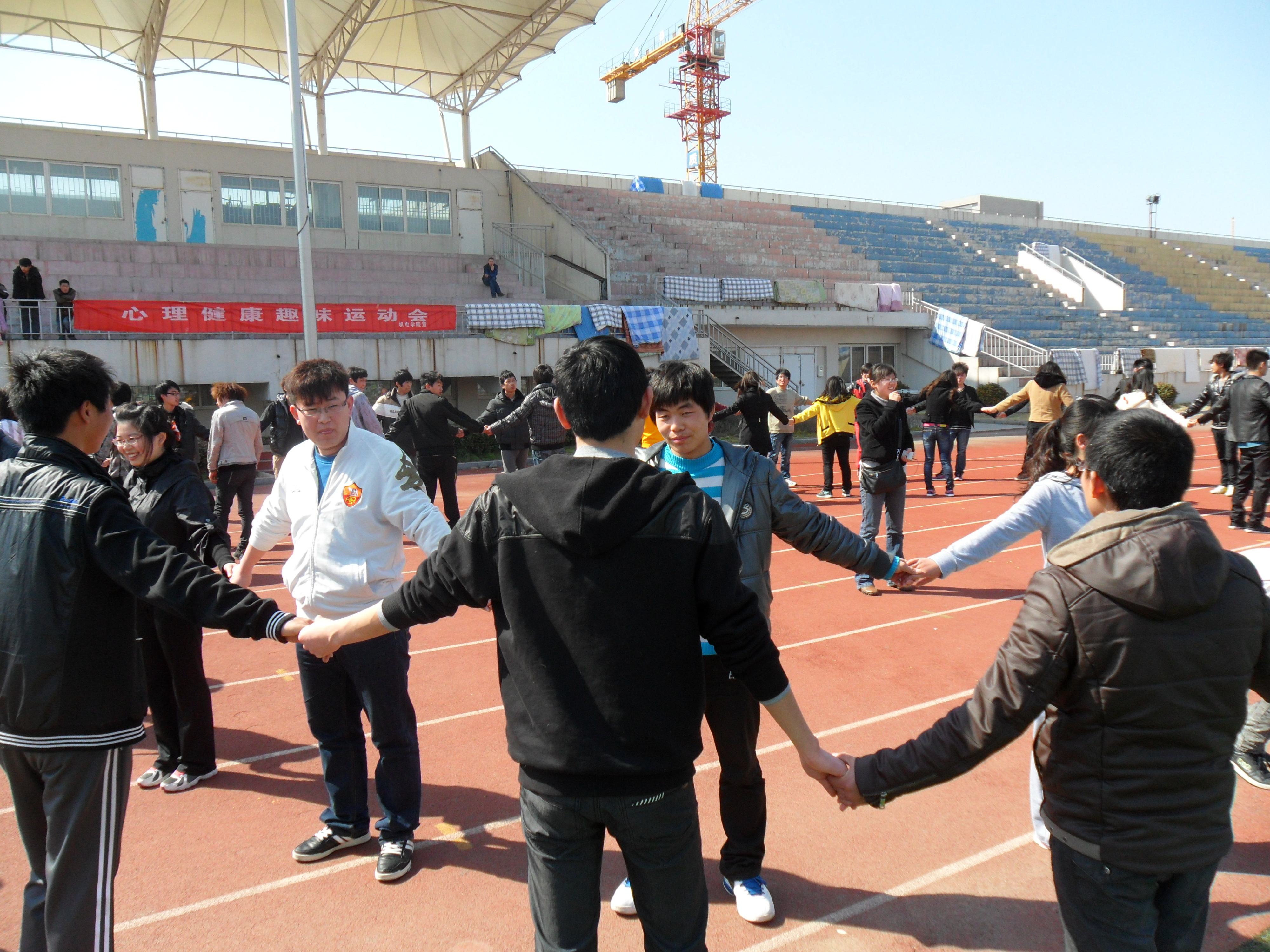 2012年3月22日 星期六下午2点,由机电工程学院员工会举办的心理健康趣味运动会在西操场正式拉开帷幕。出席本次活动的有机电工程学院辅导员邵明颖老师,员工会主席、学习部部长、体育部部长、裁判团团长等等。