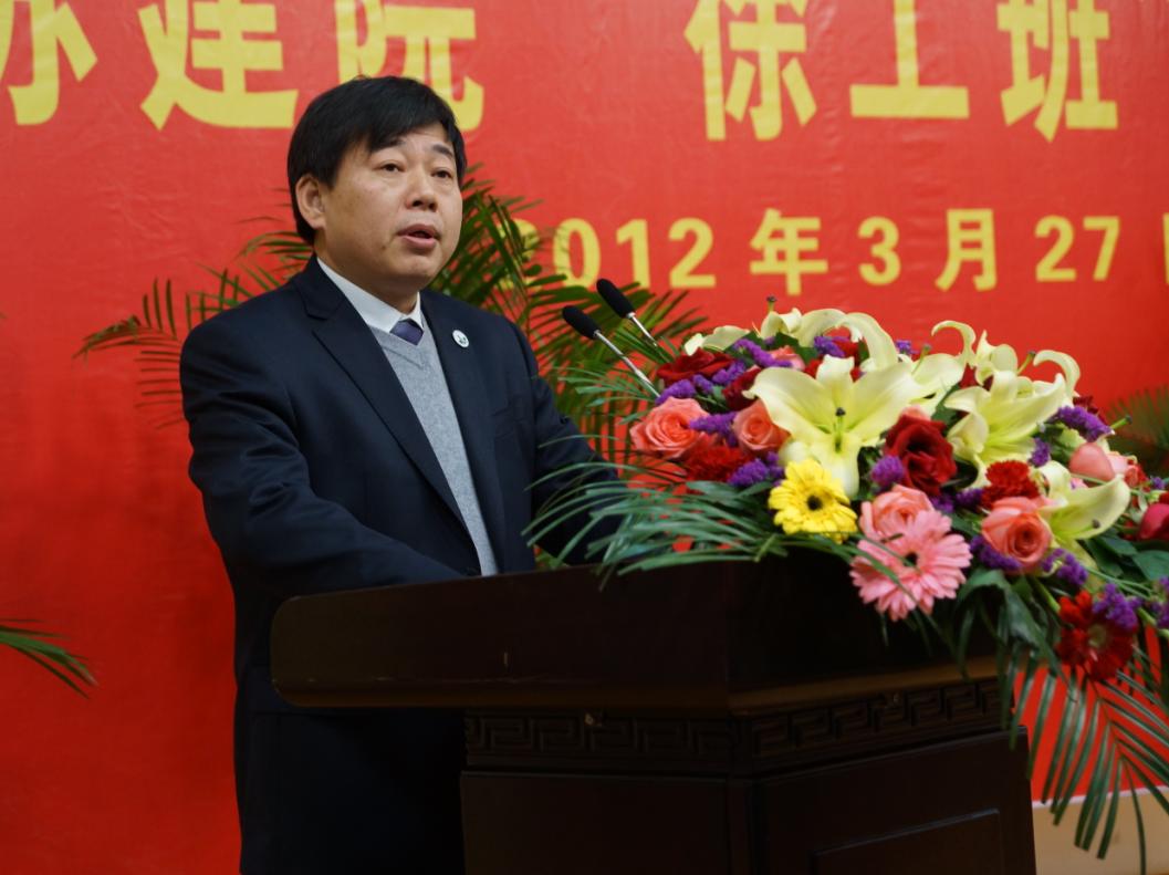校企合作办公室主任许能生主持典礼 机电公司党总支书记潘峰发言     徐工班”员工代表王乾发言