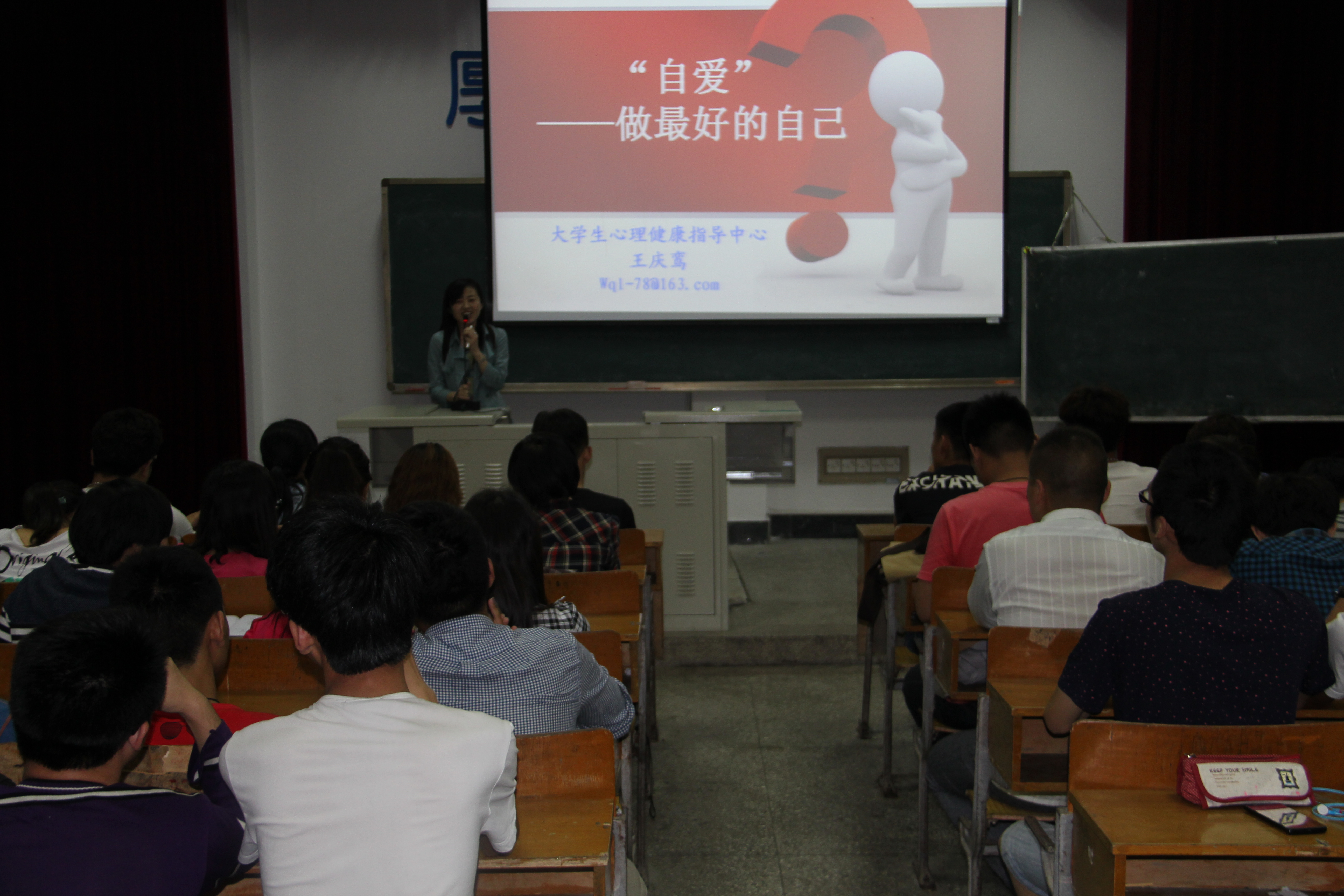 讲座正式开始之前,王老师凭借着自己多年的心理教育经验,多角度、多方面地给同学们讲述了自爱的重要性。李老师认为,善良的定义是生命受到尊重,我们要学会尊重身边的每一个人,才懂得尊重自己。同时,也只有懂得爱别人,才会懂得自爱。她着重从学会珍爱生命、培养自信心,等方面入手,从每一个人都有的感恩之心谈起,讲授内容中既有生活中的名人名事,同学们身边鲜活的例子,也有王老师自身的经历的,内容丰富生动,同学们都听得十分入神。最后,王老师就同学们提出的问题进行了详细的回答。