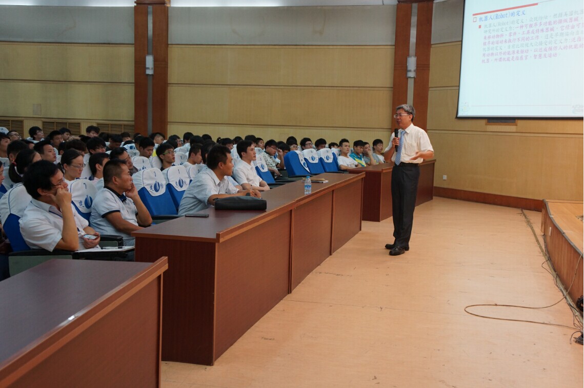 在下午的《机器人发展历程》的学术报告中,蔡教授结合大量图片信息,将全球机器人发展历程、台湾机器人发展历程、建国科技大学机器人发展历程等内容向机电学院老师及同学全面展示。蔡教授讲得风趣幽默、深入浅出,机电学院师生听得入神。报告会现场气氛热烈而融洽。