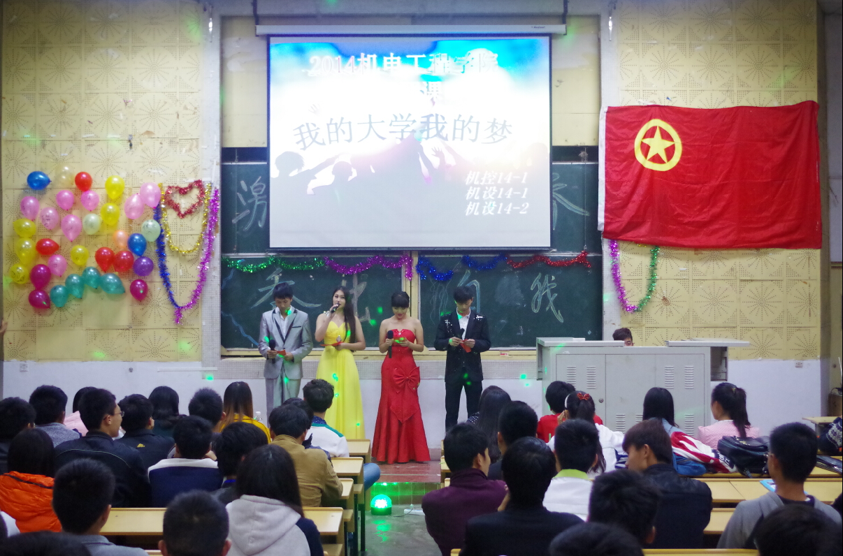 10月31日晚,由机电学院分团委主办,机控14-1、机设14-1、2三个班共同承办的主题为“我的大学,我的梦”主题团课在东阶梯如期举行。