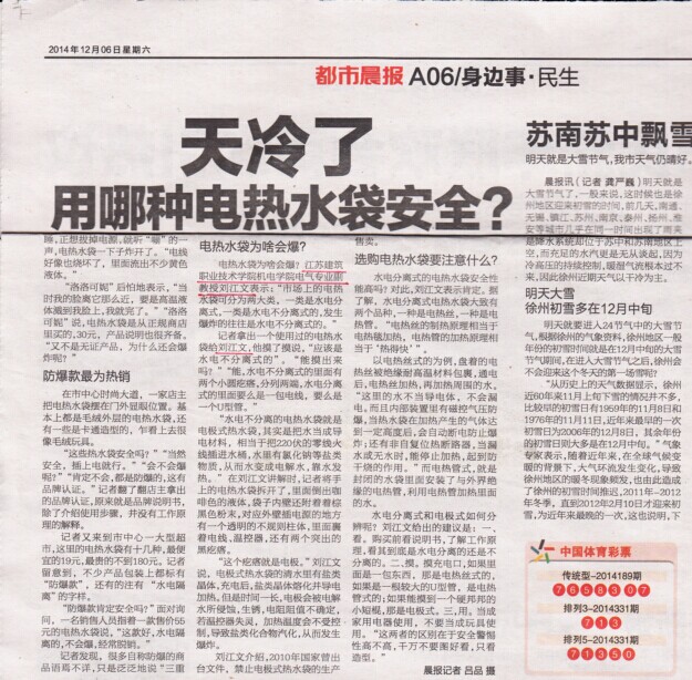 近日,公司刘江文副教授接受都市晨报的专访,作为电气方面的专家为都市晨报解读电热水袋选用方面的民生问题。
