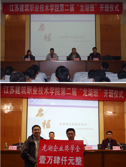 10月15日晚,第二届“龙湖班”及企业奖学金发放仪式在校学术报告厅隆重举行,这是机电学院与杭州龙湖物业公司开展深度校企合作的又一成果。机电工程公司党总支书记潘峰、杭州龙湖物业公司人力资源部经理李新星、杭州龙湖物业公司招聘专员艾泓宏、机电工程学院辅导员胡兵出席开班和颁奖仪式。龙湖班33名学员及大二、大三部分专业的员工参加了大会。