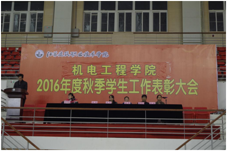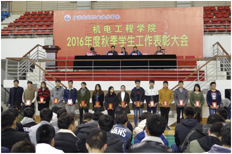 11月19日,机电学院在体育馆隆重举行2016年度秋季员工工作表彰大会。参加此次大会的有学工处副处长张侠、机电工程公司党政负责人、机电工程学院辅导员、班主任及2014、2015、2016级全体员工。