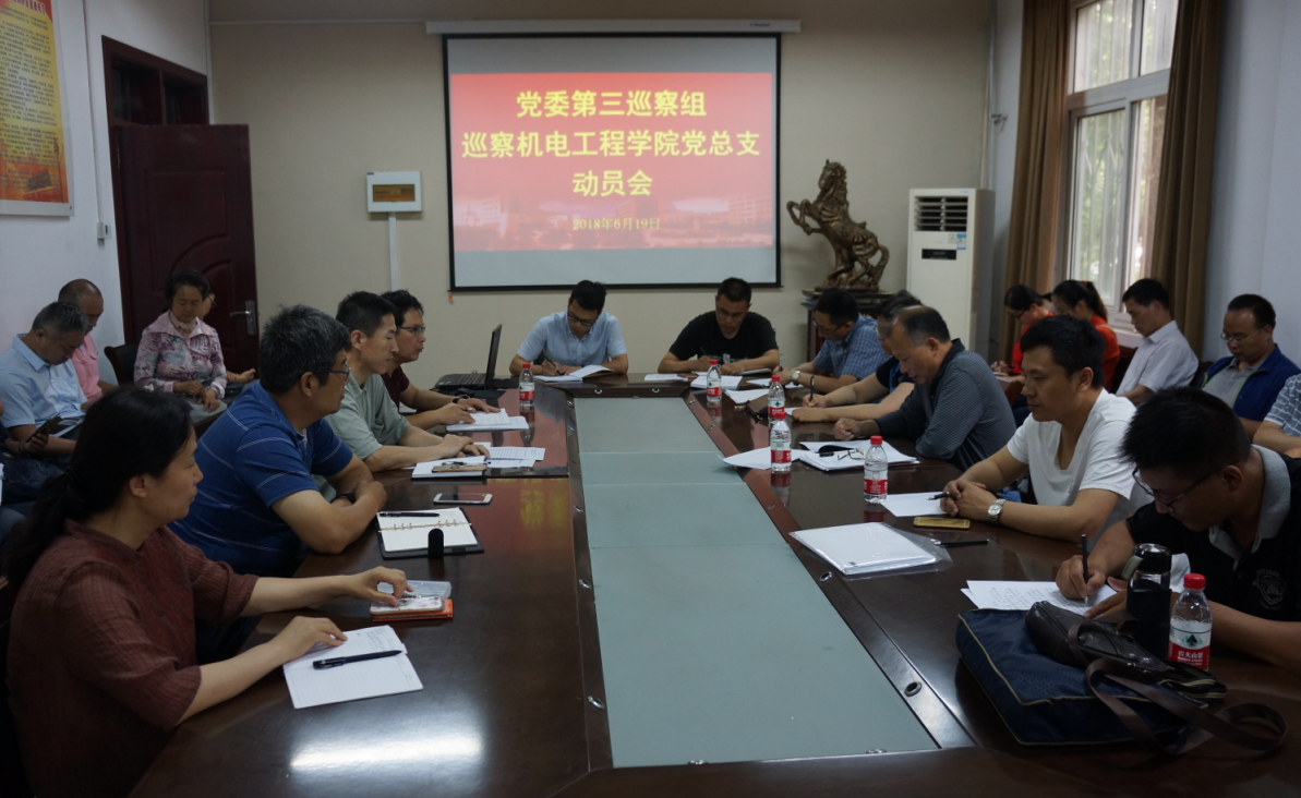6月19日下午,党委第三巡察组召开动员会。巡察组组长韩成标就即将开展的巡察工作作动员讲话,总支书记潘峰主持会议,并代表机电工程公司党总支就贯彻落实巡察组要求、配合做好巡察工作作了表态发言。党委第三巡察组副组长巩海霞及巡察组全体成员,机电工程学院班子成员,全体教职工、员工代表参加会议。