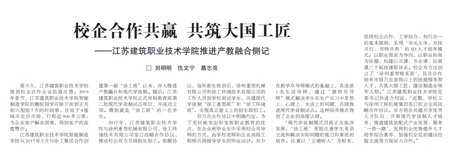 “现代学徒制模式目前正在纵深发展,‘徐工班’更加注重员工英语交流和解决实际问题的能力和素质的培养;注重以‘立德树人’为根本,坚持校企合作、工学结合、知行合一的基本原则,采用‘双元主体、双线并行、双师共育’的3D人才培养模式;以职业需求为导向,以职业标准为依据,构建公共课、专业课、拓展课三个板块课程体系。校企双方还创立了‘徐州重型精英班’,旨在合作培养市级乃至省级以上的技能精英型人才,共筑大国工匠,建设制造业领军人物。”江苏建筑职业技术公司党 书记孙进介绍说,“近期,学校又与徐州工程机械集团签订校企全面战略合作协议。双方将在共建共享优秀人才队伍、开展现代学徒制人才培养、推进建筑装配式产业发展、服务‘一带一路’、发挥校企优势提升人才培养综合素养、加强校企党的建设经验交流等方面深入合作。”
