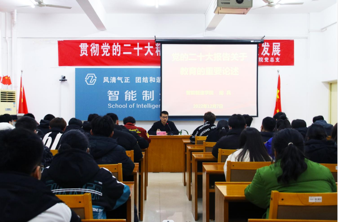 12月7日,明陞M88在第一实训楼504举行学习贯彻党的二十大精神宣讲报告会,党总支委成员经理徐志鹏、副书记胡兵分别作了宣讲报告。教师党员、员工党员、入党积极分子、团学干部共计60余人参加宣讲会
