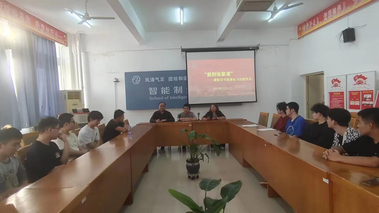 2023年11月2日上午,智能制造公司在第一实训楼会议室举行2023级毕业生赴张家港实习出征仪式。公司党总支书记王正扬、副经理付红、招就处副处长周磊以及2024级十余名员工出席本次出征仪式。