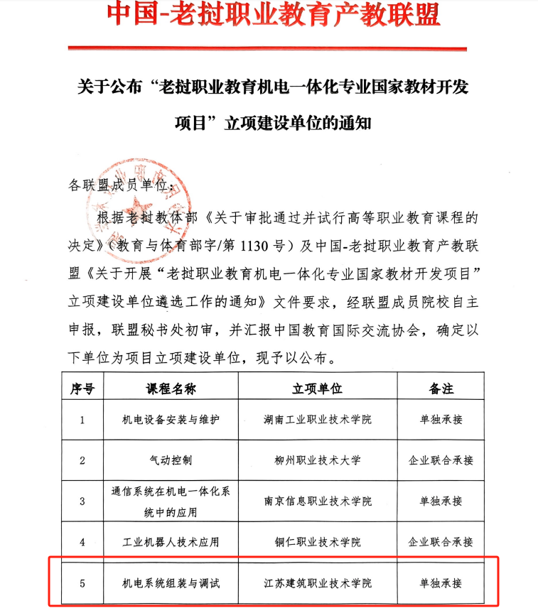 近日,公司获批老挝职业教育机电一体化专业国家教材开发项目,负责《机电系统组装与调试》课程教材的开发建设工作。该项目经老挝教育与体育部立项,由中国-老挝职业教育产教联盟具体实施,主要针对老挝机电一体化技术员岗位,基于前期已研发职业能力标准和课程体系,研发课程教材和配套教学资源,指导和助力老挝职业院校开设新专业和人才培养工作。