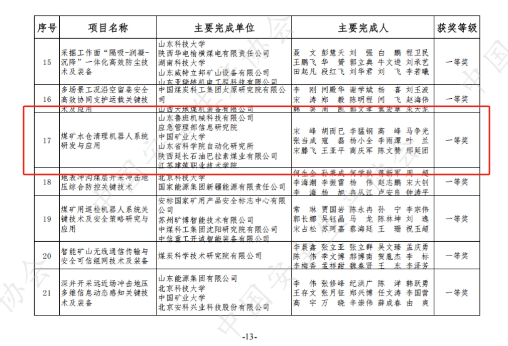 近日,中国安全生产协会公布了第五届安全科学技术奖获奖名单。公司作为参与单位,公司李雨潭副教授作为项目参与人的“煤矿水仓清理机器人系统研发与应用”获科技进步奖一等奖。