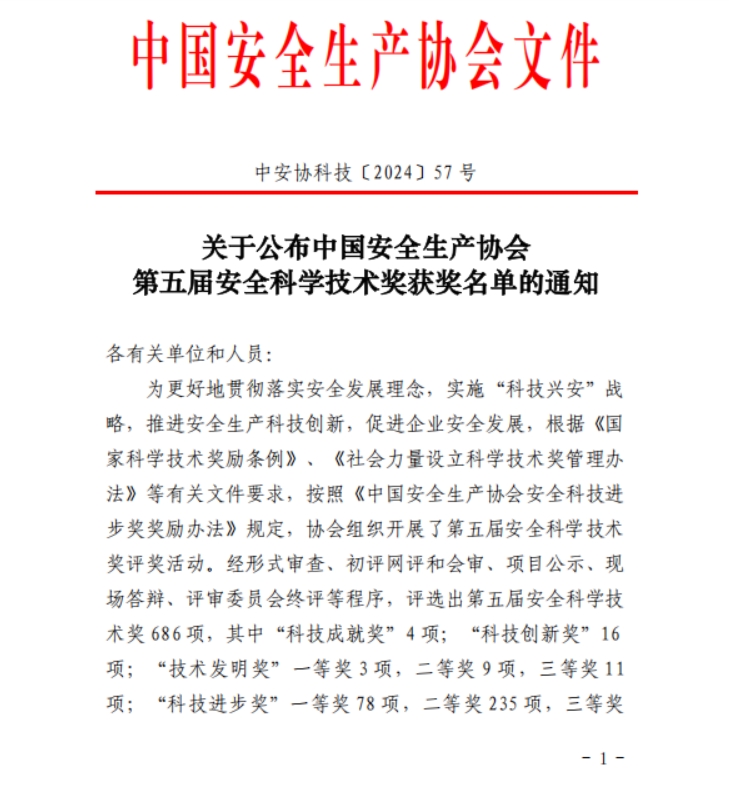 中国安全生产协会安全科技进步奖是经国家科学技术奖励办公室批准设立的安全生产领域唯一全国性的安全科技奖项。奖励在安全生产领域中为基础理论和管理方法研究、技术标准制定、科学技术发明、科技成果研发和转化、设施设备技术改造和创新等工作中做出突出贡献的单位和个人。据悉,本次经形式审查、初评网评和会审、项目公示、现场答辩、评审委员会终评等程序,评选出第五届安全科学技术奖686项,其中“科技成就奖”4项;“科技创新奖”16项;“技术发明奖”一等奖3项,二等奖9项,三等奖11项;“科技进步奖”一等奖78项,二等奖235项,三等奖330项。